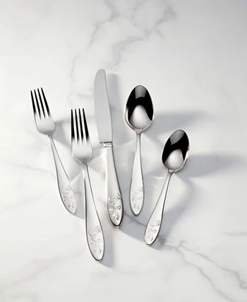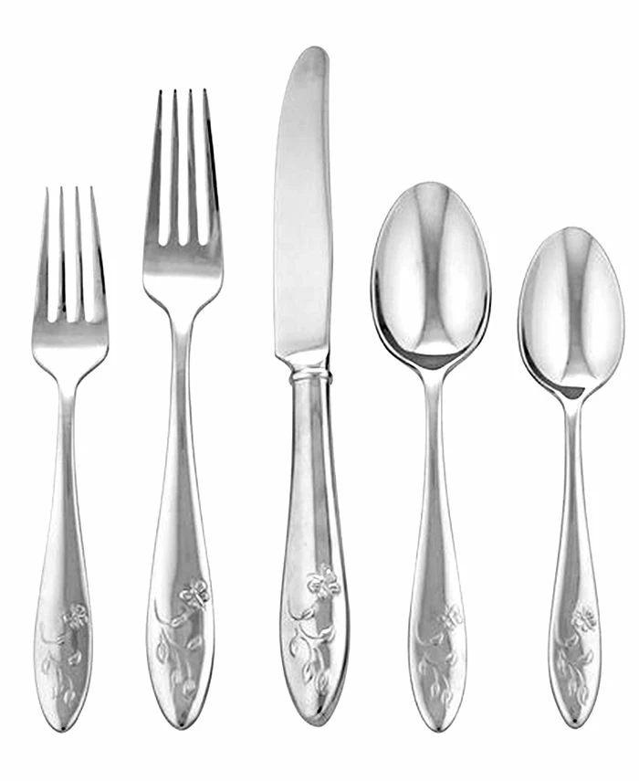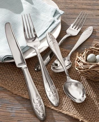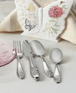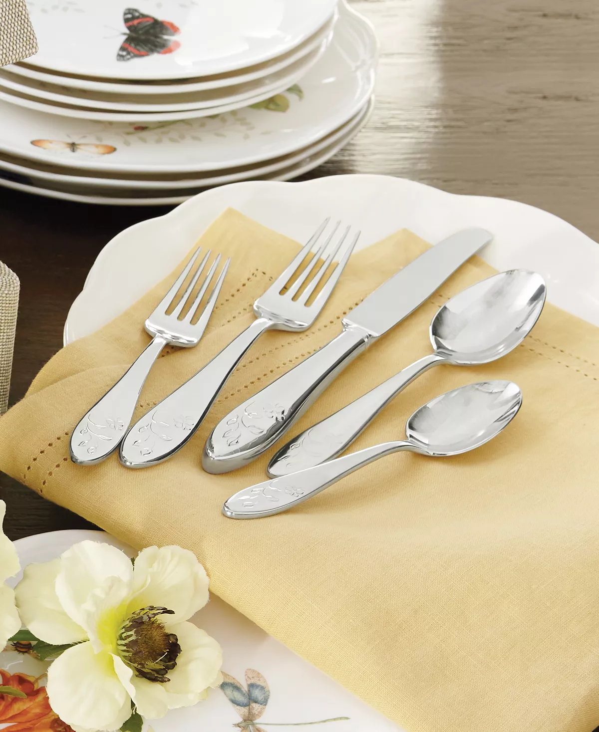 A butterfly and sprig of leaves accent each handle in the charming Lenox Butterfly Meadow place settings. Crafted in 18/10 stainless steel for lasting shine and durability.