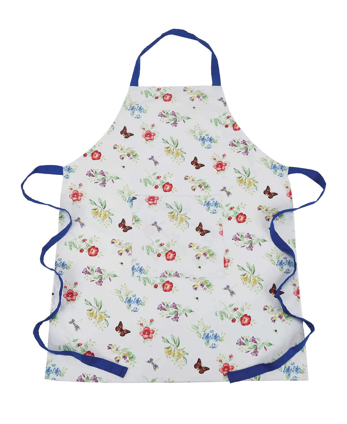 Lively butterflies, dragonflies and bumblebees buzz about a variety of vibrant flowers on this new Butterfly Meadow Apron.
