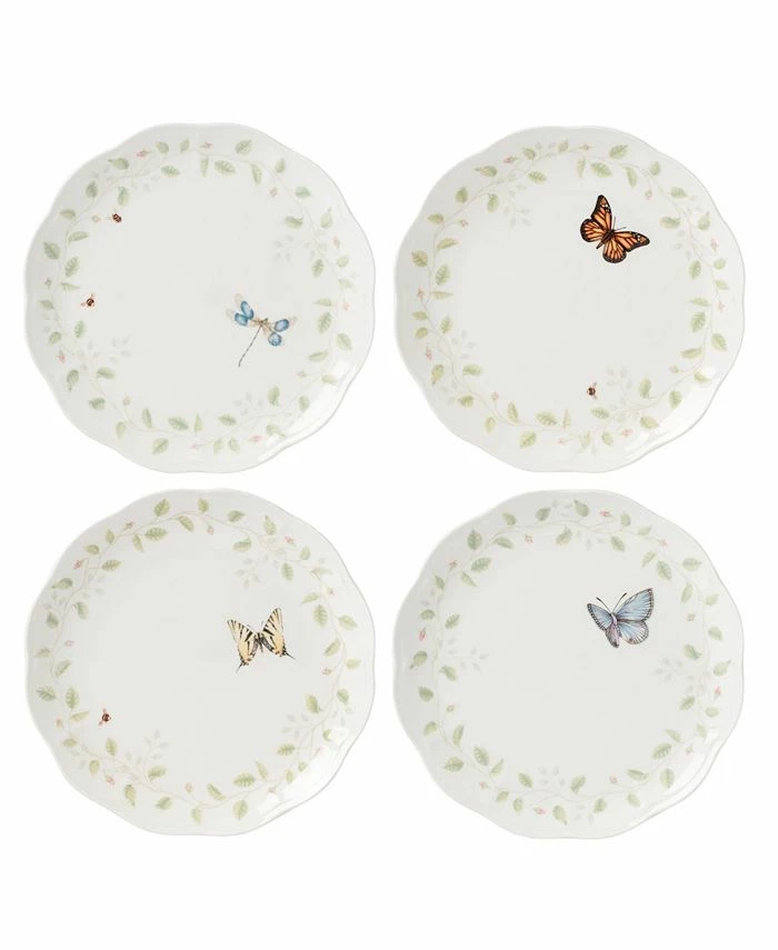Lively butterflies, bees, and dragonflies zip about vibrant foliage on these additions to the Butterfly Meadow collection. The trademark design features elegantly scalloped edges on durable white ceramic porcelain. Each piece in the set is unique.