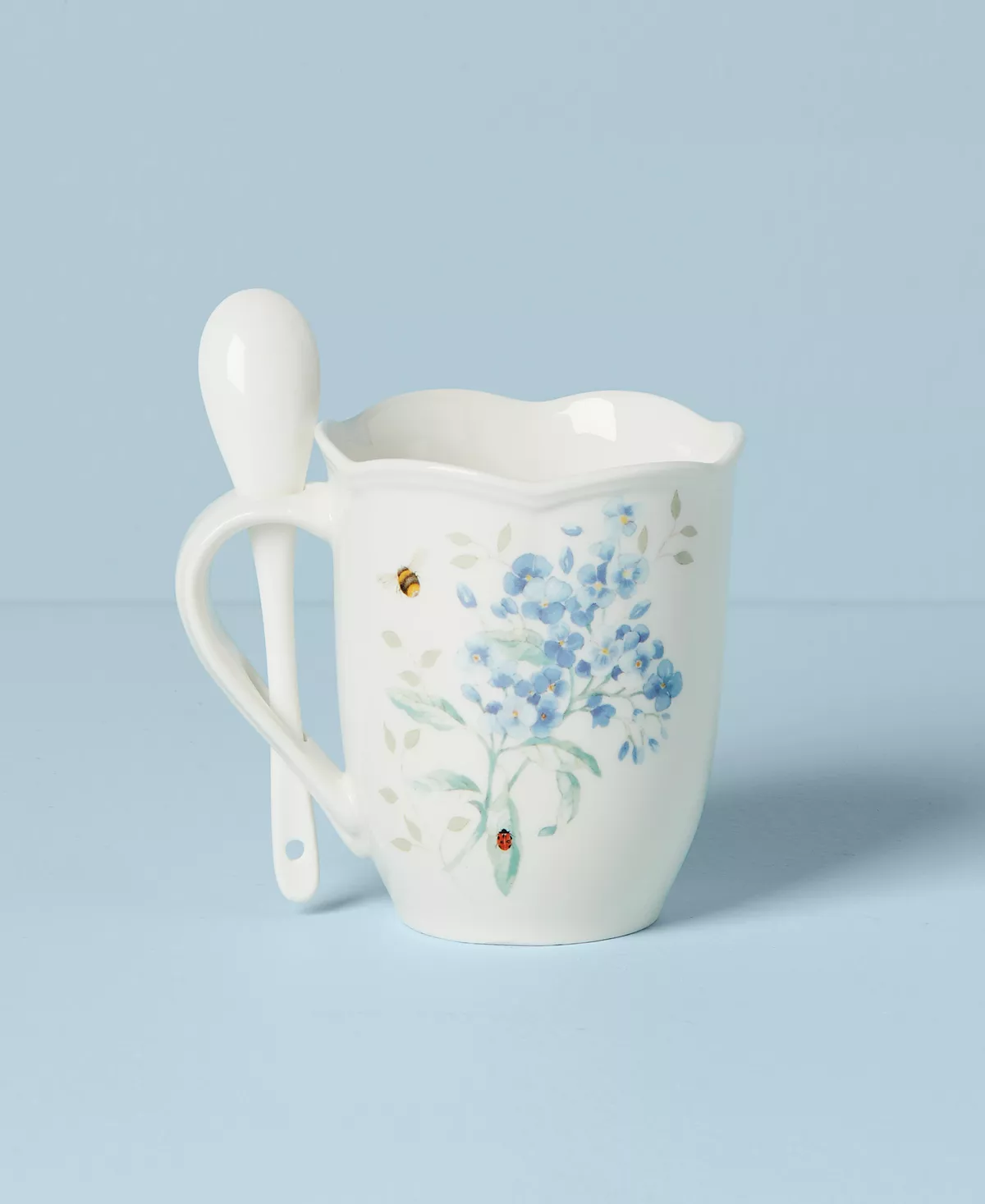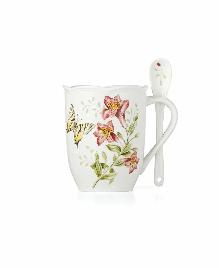 A vibrant springtime illustration featuring the classic Butterfly Meadow design on white ceramic porcelain of the Mug and Spoon Set. With scalloped edges and fluttering butterflies, the handles are slotted for the placement of stir spoons. Dishwasher and Microwave Safe.