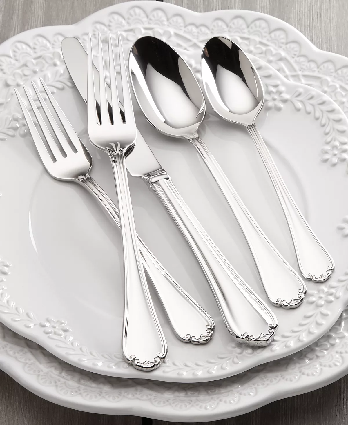 - Set includes 12 of each: salad fork, dinner fork, dinner knife, soup spoon and dessert spoon