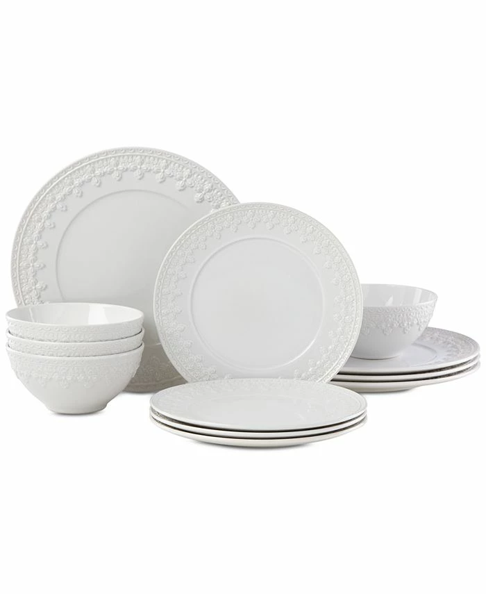 Make the simple act of everyday dining a regal affair with the gorgeous 12-piece Chelse Muse Fleur Dinnerware Set by Lenox. An intricate and textural stylized floral motif around its rims is accentuated by a reactive glaze for a look that is delightfully sophisticated and subtly bold.