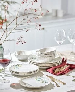 A festive fresh spin on the French Perle favorites. These dinner plates feature artistic varieties of holiday holly with leaves, branches, and berries in a handpainted style. Crafted with smooth scallops on a snowy white base for a creative winter feel.”Peace & Joy”