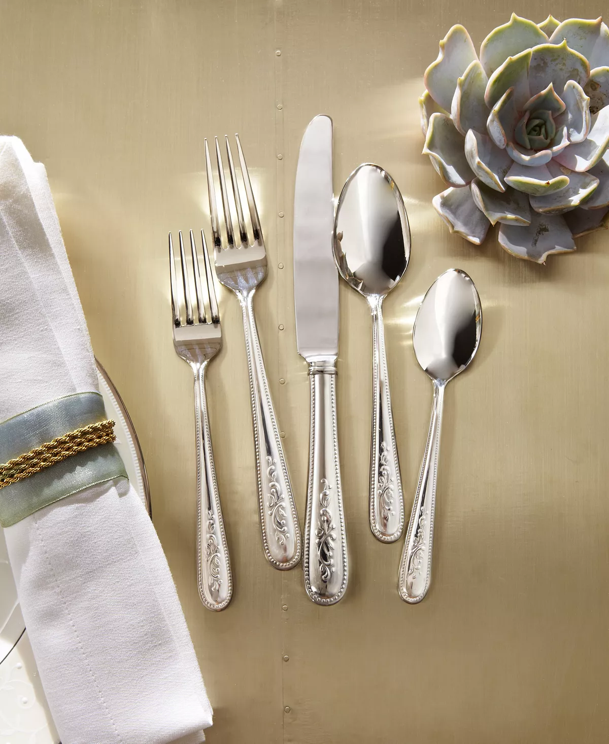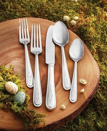 Irresistible modern splendor for every table. This polished stainless steel flatware features the delightful vine motif of the Opal Innocence place settings collection, framed by romantic bead edging.