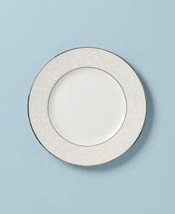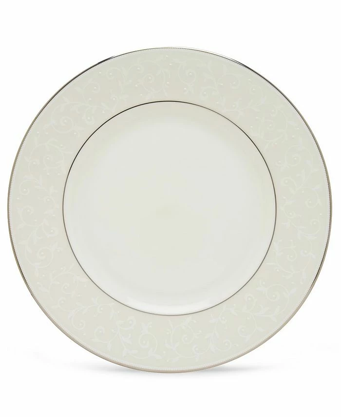 Pure opulence. Posh opalescence. This classically designed line of dinner plates from Lenox’s dinnerware and dishes collection are accented by a platinum rim and a delicate flourish of vine-like, white-on-white imprints with raised, iridescent enamel dots. Great gift for housewarming, wedding or yourself. Dinner plate shown center.
