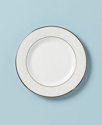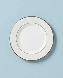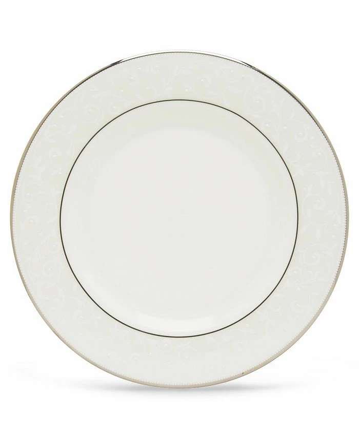 Pure opulence. Posh opalescence. This classically designed line of Lenox dinnerware and dishes is accented by a platinum rim and a delicate flourish of vine-like, white-on-white imprints with raised, iridescent enamel dots. Great gift for housewarming, wedding or yourself.