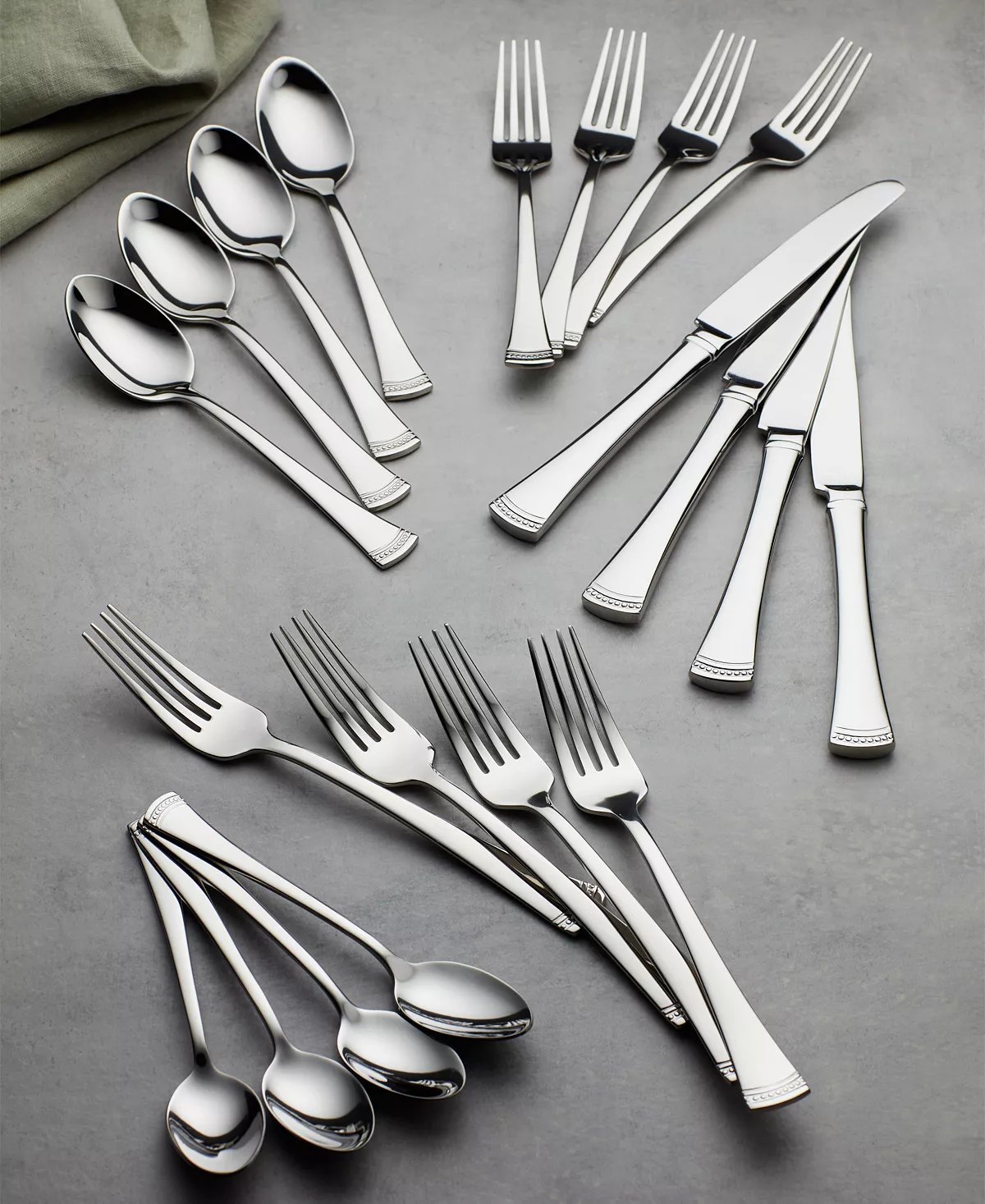 Portola flatware features flared handles with a beaded channel at each base. Crafted from brilliant 18/10 stainless steel, this elaborate and elegant flatware set.