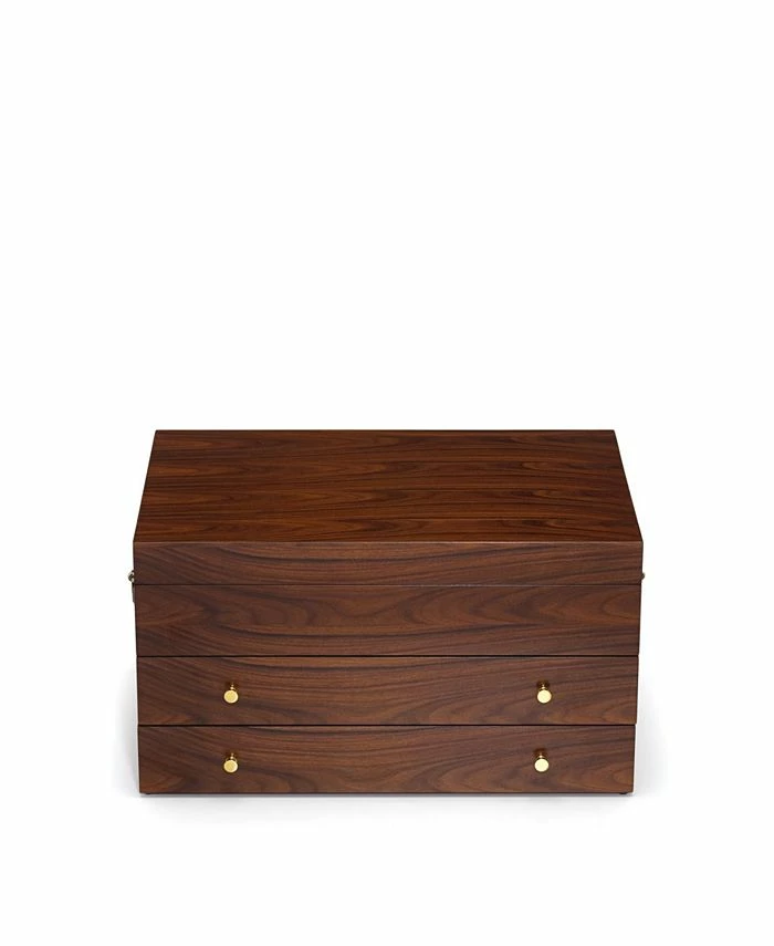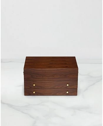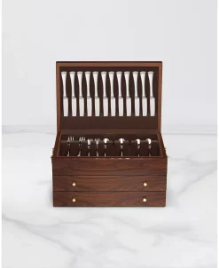 Make room for your large flatware sets by storing it into this handsome flatware chest crafted of rosewood. Lift the lid at the tiny gold-tone handle to unveil two sections – a top section to tuck in steak knives and a bottom section that separates out spoons, forks and more.