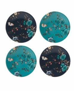 Sprig & Vine tidbit plates are an assortment of the navy and turquoise solid color glaze with gold decals. Includes 4 tidbit plates, two navy and 2 turquoise.