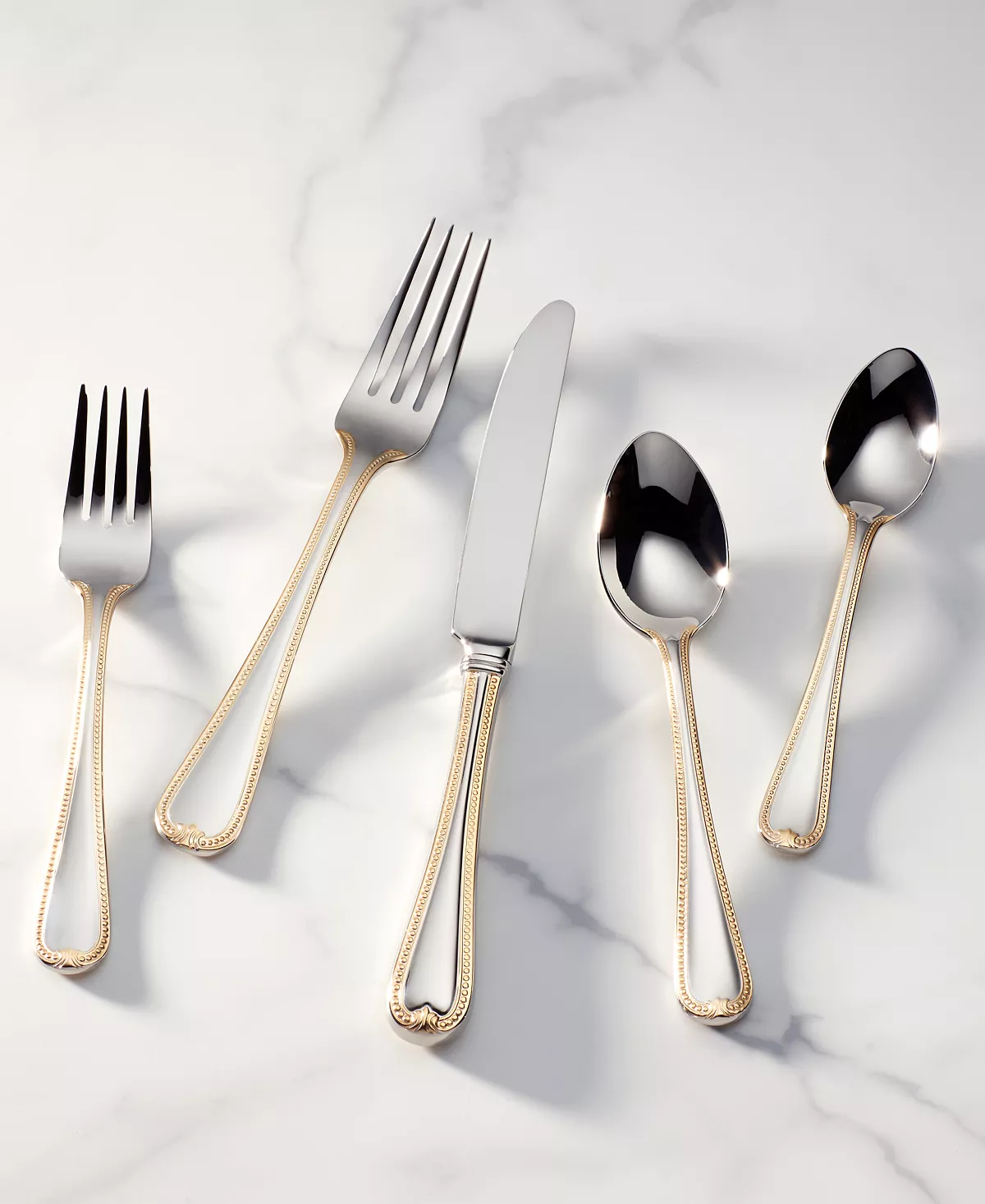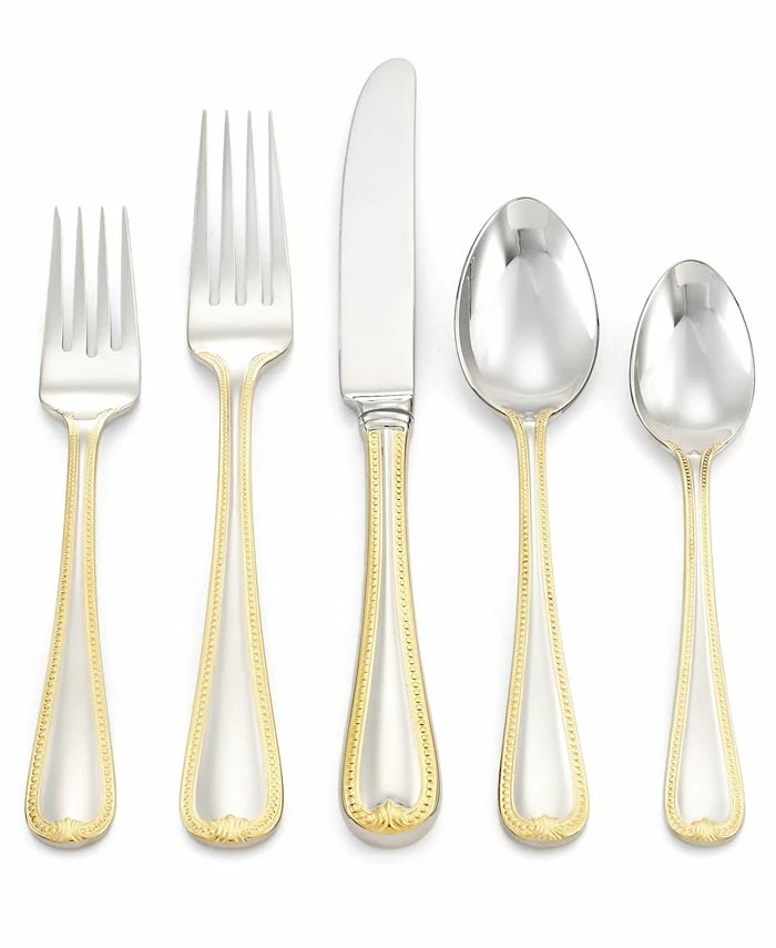 The golden touch. A traditional beaded pattern and teardrop shape lend the Vintage Jewel Gold place setting to your finest dining occasions. Rendered in 18/10 stainless steel for lasting shine and durability. From Lenox.
