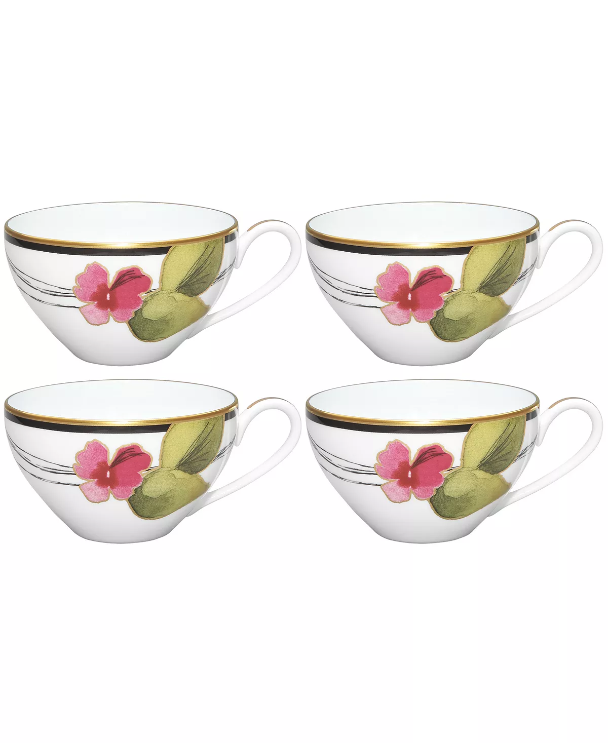 Alluring fields showcases a Japanese-inspired floral design, featuring vibrant watercolor flowers on ultra bright, strong white porcelain. Each piece in the collection features a single floral applied to the surface. The edges of each piece are adorned with a gold-tone and black band.