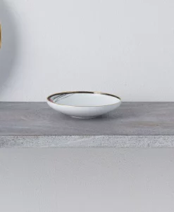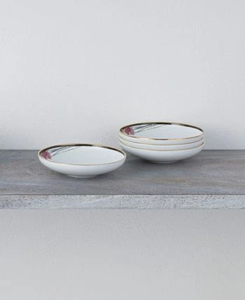Alluring fields showcases a Japanese-inspired floral design, featuring vibrant watercolor flowers on ultra bright, strong white porcelain. Each piece in the collection features a single floral applied to the surface. The edges of each piece are adorned with a gold-tone and black band.