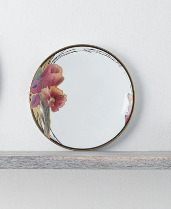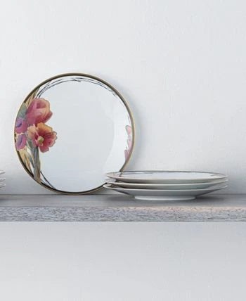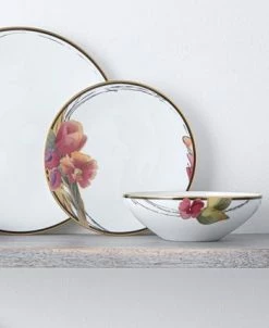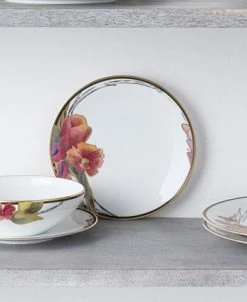 Alluring fields showcases a Japanese-inspired floral design, featuring vibrant watercolor flowers on ultra bright, strong white porcelain. Each piece in the collection features a single floral applied to the surface. The edges of each piece are adorned with a gold-tone and black band.