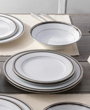Austin platinum brings sophisticated elegance to the table. This stunning pattern features crisp bright white porcelain, paired with chic black and platinum bands. The 2 black bands are polka-dotted and solid, and the exterior platinum band is etched with an infinite scroll design.