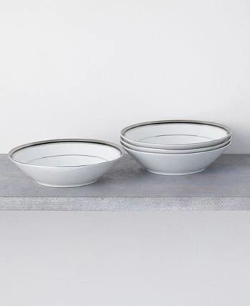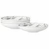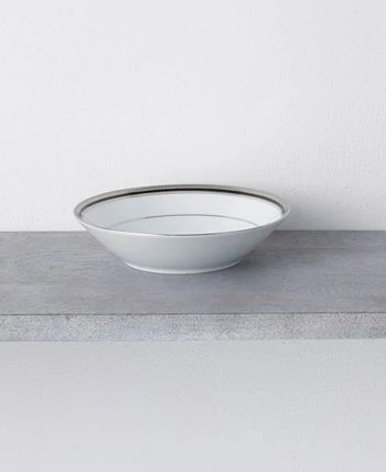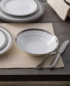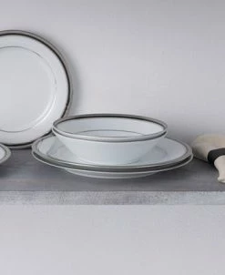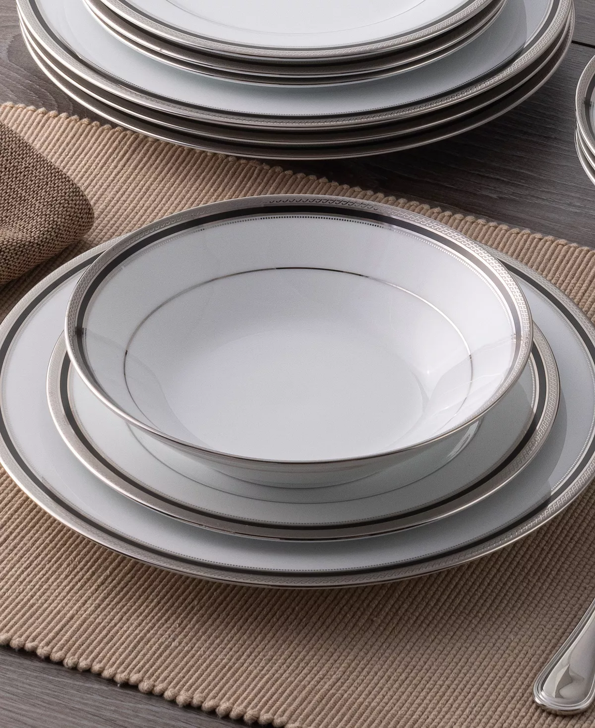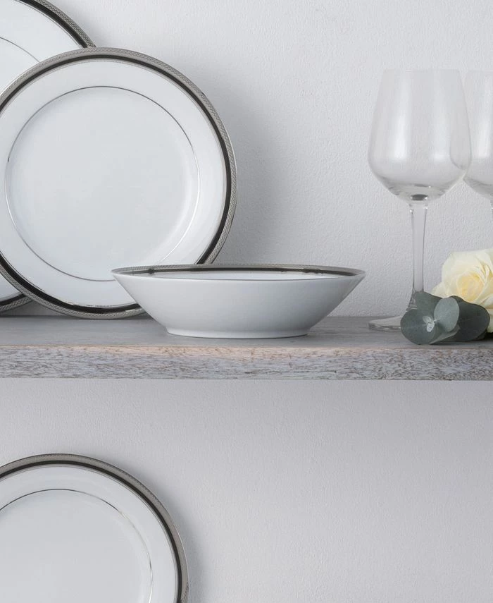 Austin platinum brings sophisticated elegance to the table. This stunning pattern features crisp bright white porcelain, paired with chic black and platinum bands. The 2 black bands are polka-dotted and solid, and the exterior platinum band is etched with an infinite scroll design.