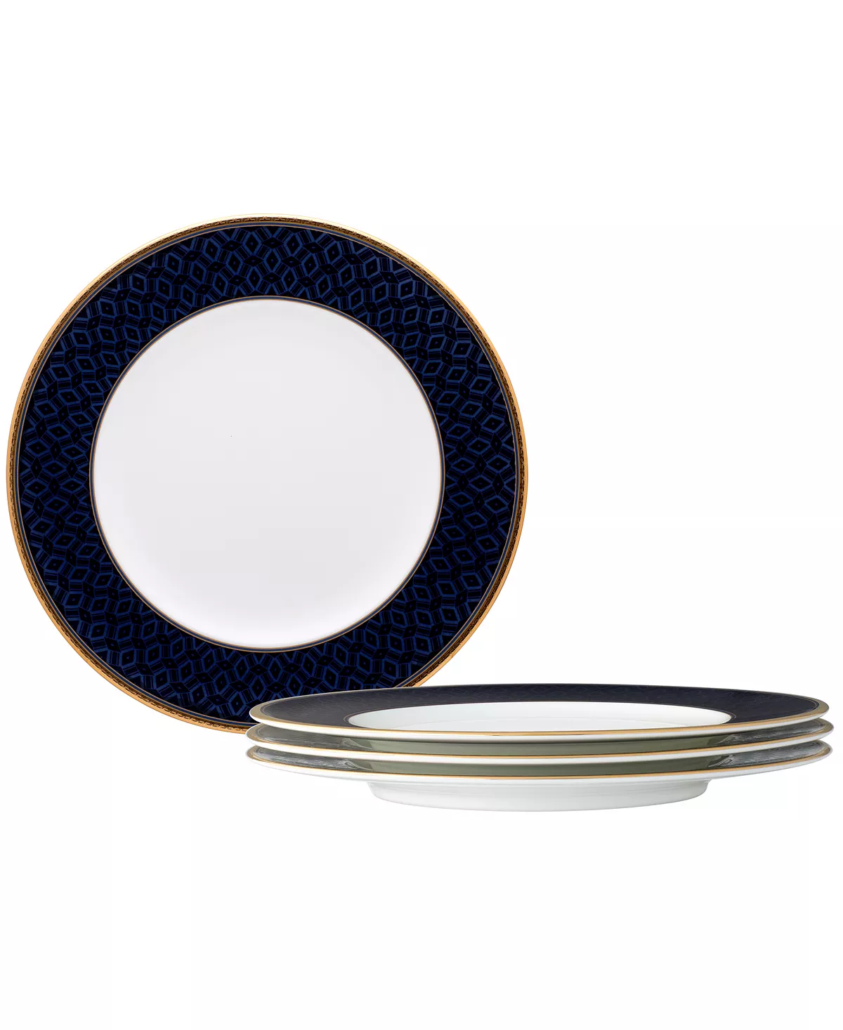 Blueshire is an elegant, modern design on bone China. Featuring a repeating mosaic of a simple diamond shape depicted vertically and horizontally, the three-dimensional design in shades of blue is paired with a gold-tone band featuring raised interlocking T-bars.