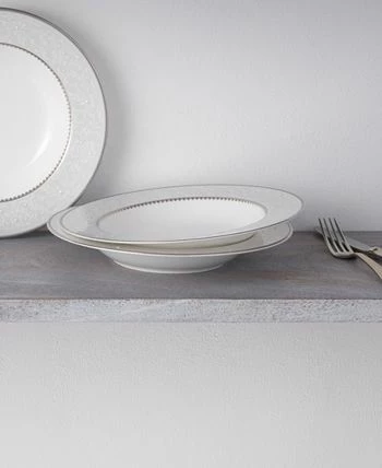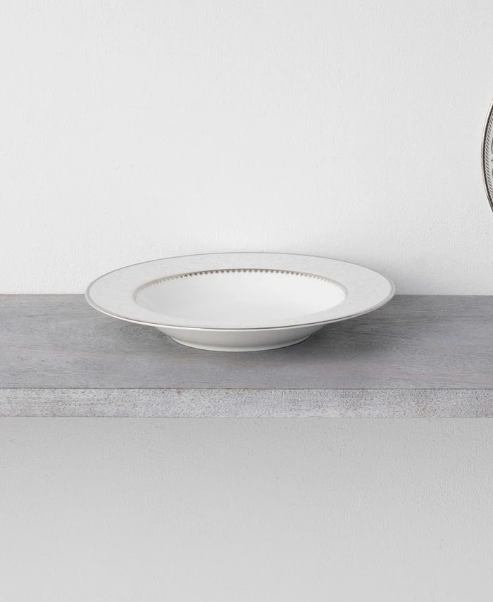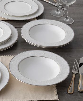 Brocato is a bone China dinnerware collection adorned with an antique-like floral lace design over a misty gray. This design is accompanied by a platinum band and a hint of cadet gray. Brocato offers place setting components as well as an array of serving pieces and accessories.