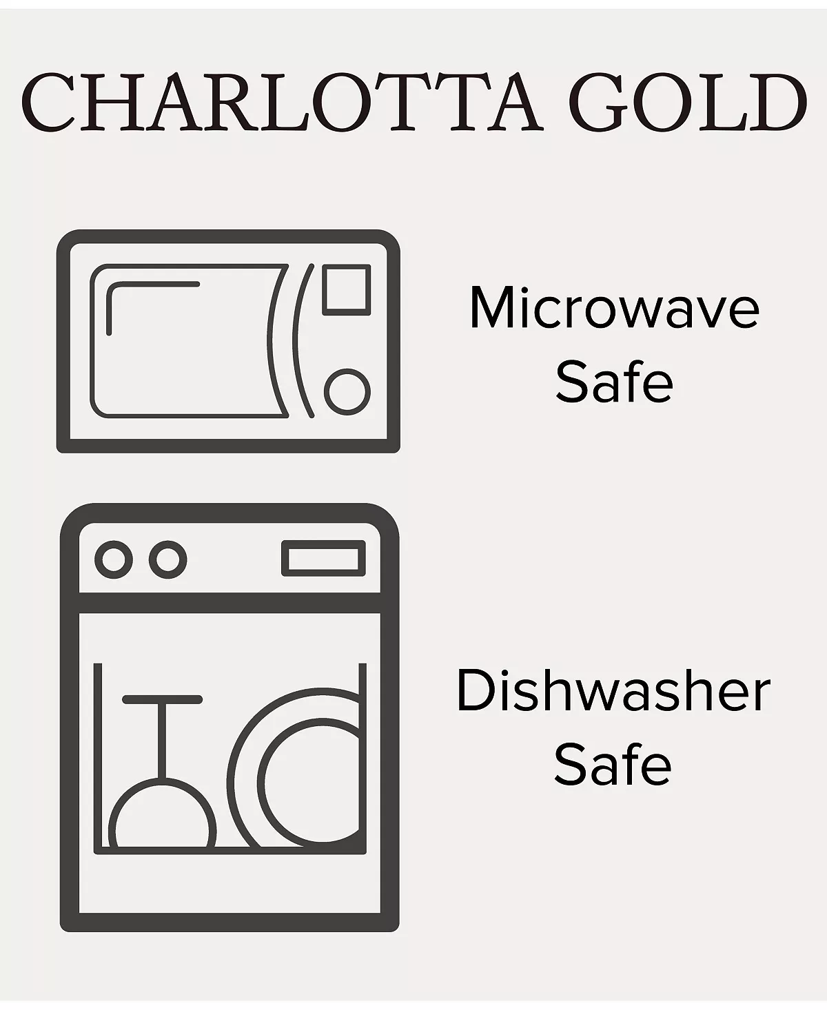 Charlotta Gold is a beautifully classic collection in white porcelain, featuring the modern addition of microwave-safe gold The prominent gold banding features flowers and scrolling leaves, perfect for elegant dinners while casual enough for daily use.
