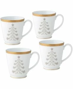 Newly introduced in 2021, the popular charlotta gold tone is a set of holiday accessories. Mugs and accent plates are introduced in 2 different designs. The harvest items feature leaves, pine cones, and berries in bronze, while the tree items showcase a stylized Christmas tree in silvery tone-gray.