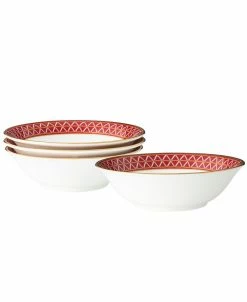 Crochet is a stunning, strongly-geometric dinnerware pattern on bone china. The combination of gold banding and grey design elements brings a mixed-metal look, paired with a deep red color for maximum impact and ambience.