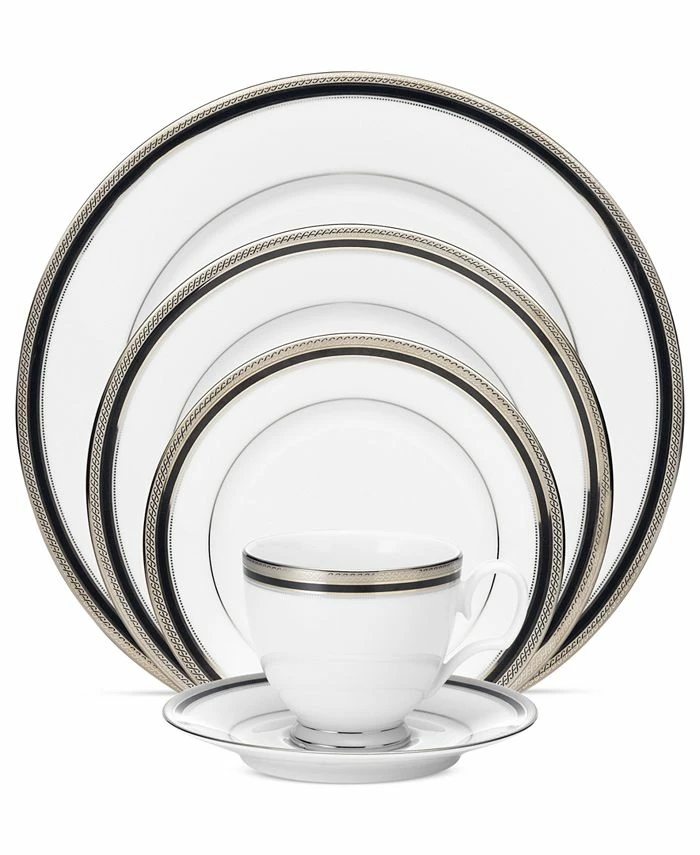 An instant classic, the Austin Platinum place setting from Noritake layers ribbons of black with patterned platinum bands and shimmering dots. White porcelain grounds the timeless dinnerware, a flawless choice for fine occasions.