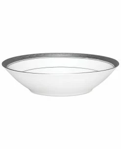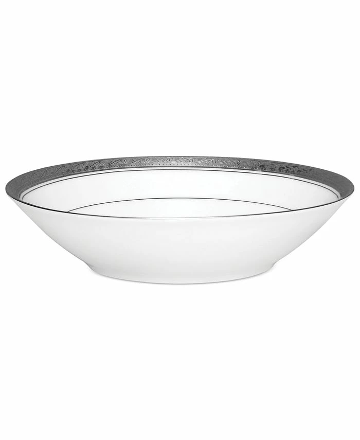 The Crestwood Platinum dinnerware and dishes collection from Noritake features white china embellished with a border of interlocking scrolled leaves and an edge of polished platinum.
