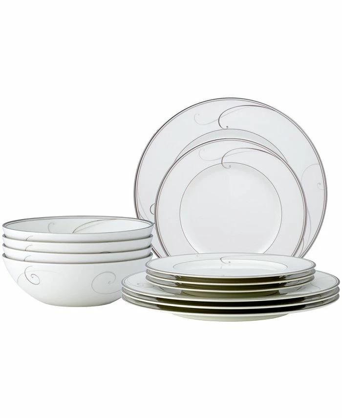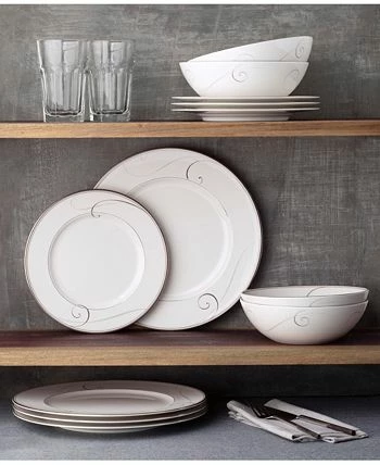 Platinum Wave is a more relaxed approach to formal dinnerware. Keeping to a simple modern feeling, this pattern interprets a classic scroll motif in an updated and playful manner. Washing against the rim of the plate, the platinum waves create a bold, yet elegant presentation.
