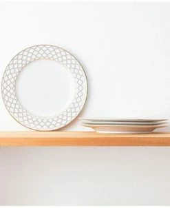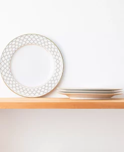 Eternal Palace features an interlocking stylized ogee design, presented in multiple sizes on different pieces for maximum impact. These modern elements are paired with solid presentations of a classic gold banding.
