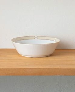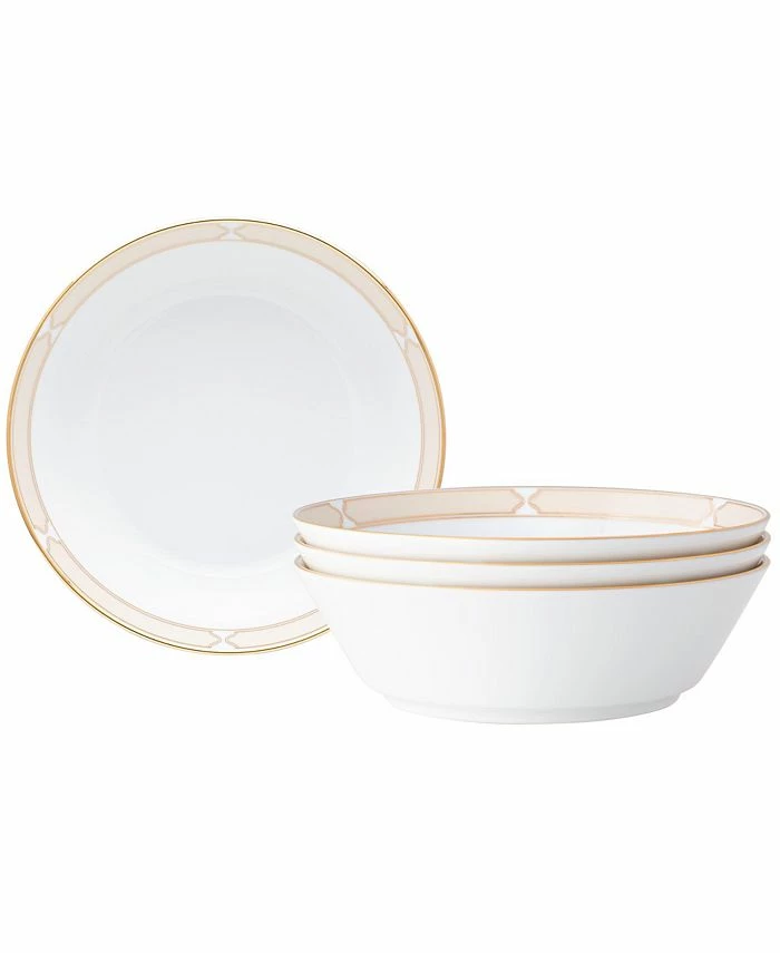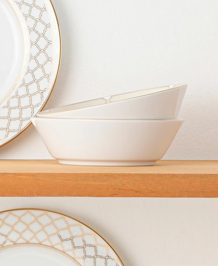 Eternal Palace features an interlocking stylized ogee design, presented in multiple sizes on different pieces for maximum impact. These modern elements are paired with solid presentations of a classic gold banding.