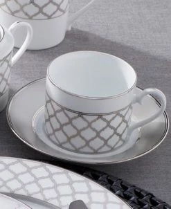 Eternal Palace features an interlocking stylized ogee design, presented in multiple sizes on different pieces for maximum impact. These modern elements are paired with solid presentations of a silvery-grey and classic platinum banding.
