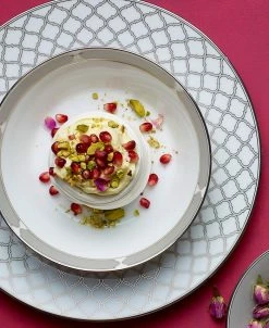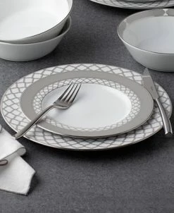 Eternal Palace features an interlocking stylized ogee design, presented in multiple sizes on different pieces for maximum impact. These modern elements are paired with solid presentations of a silvery-grey and classic platinum banding.