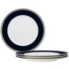 Infinity Blue is a bold pattern on bone china. Items are adorned with a fret pattern, interpreted as interlocking keys and blocks in shades of blue. Additionally, Infinity Blue items are embellished with raised enamel dots and 2 types of platinum banding.