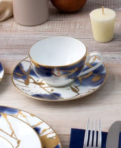 Jubilant days gold is an abstract celebration, featuring a base of random swatches of cobalt blue, and splashes of shimmering gold-tone on white porcelain. Jubilant days gold offers place setting components as well as an array of serving pieces and accessories.