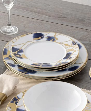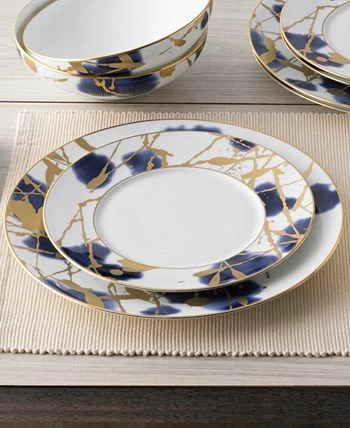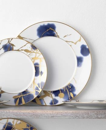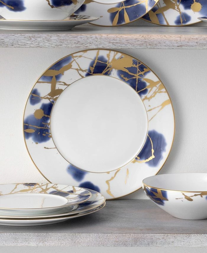Jubilant days gold is an abstract celebration, featuring a base of random swatches of cobalt blue, and splashes of shimmering gold-tone on white porcelain. Jubilant days gold offers place setting components as well as an array of serving pieces and accessories.