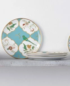 Lodi’s Morning has a durable pattern. The salad plates depict striking floral and a parakeet in a beautiful blue shade with touches of saffron and ruby.