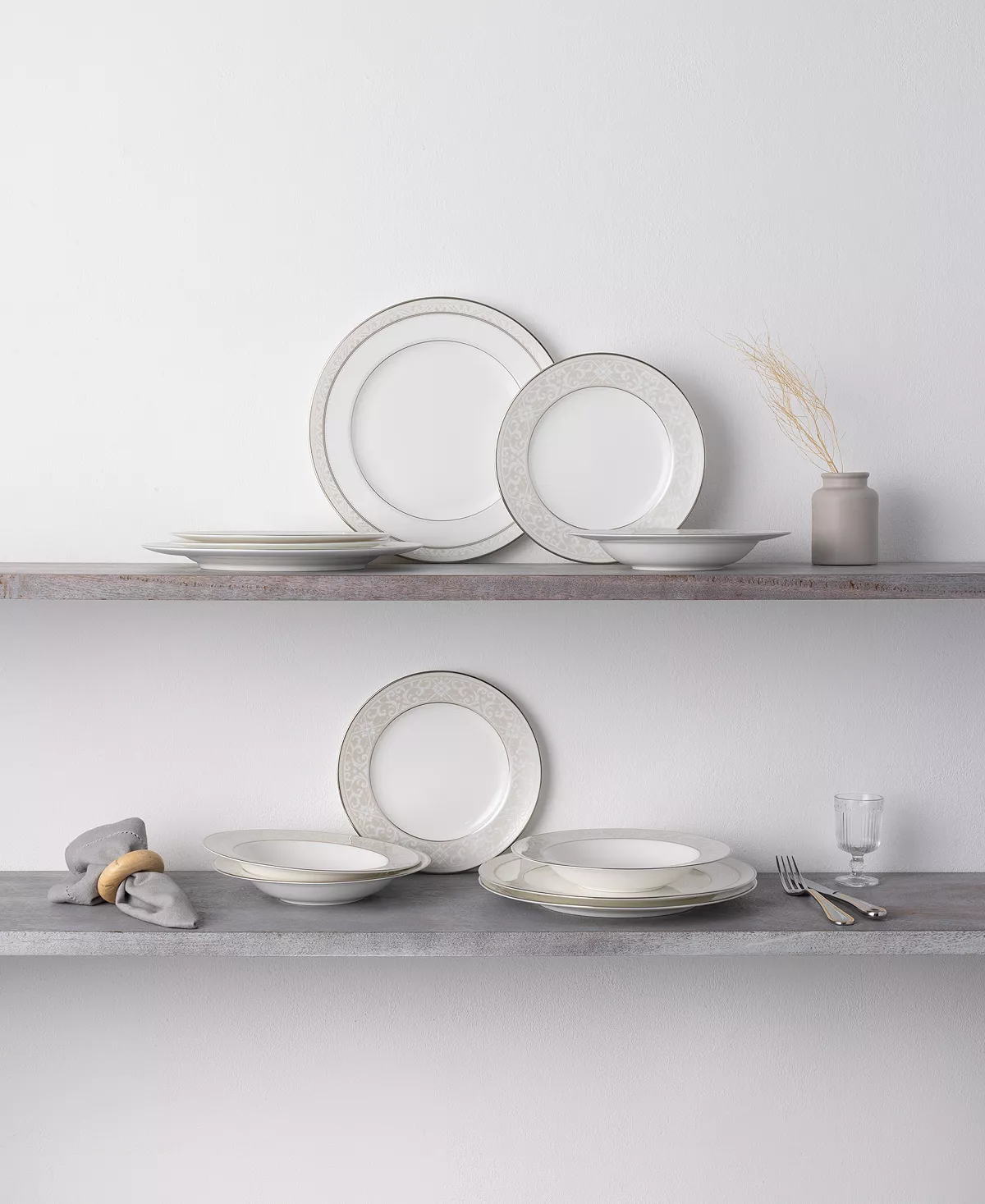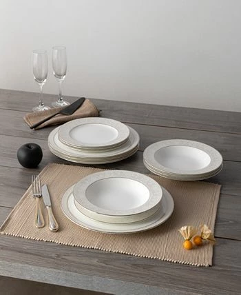 Montvale platinum features a narrow rim decoration of delicate white scrolls laid over a champagne-colored background, edged in platinum. Crafted in fine bone China, Montvale platinum offers place setting components as well as an array of serving pieces and accessories.