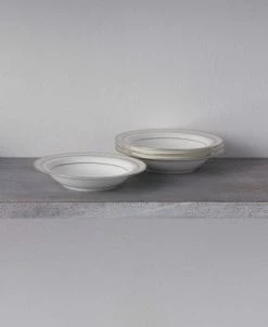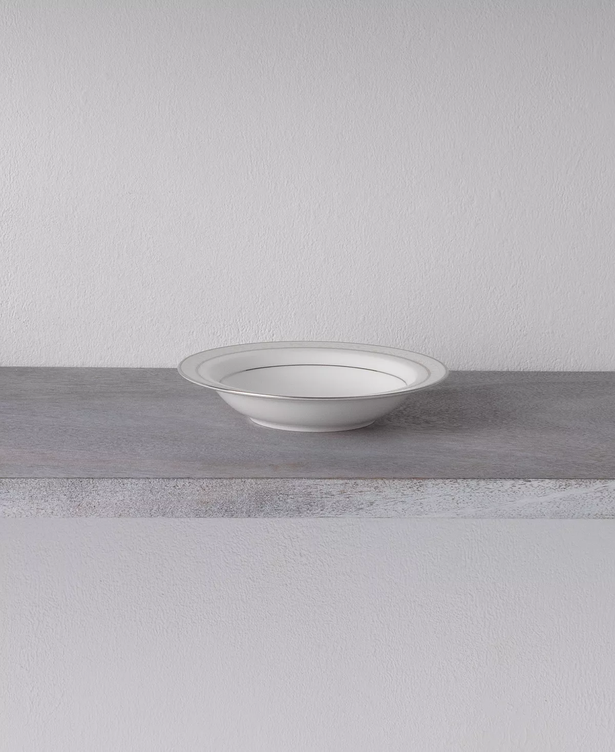 Montvale platinum features a narrow rim decoration of delicate white scrolls laid over a champagne-colored background, edged in platinum. Crafted in fine bone China, Montvale platinum offers place setting components as well as an array of serving pieces and accessories.