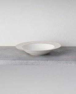 Montvale platinum features a narrow rim decoration of delicate white scrolls laid over a champagne-colored background, edged in platinum. Crafted in fine bone China, Montvale platinum offers place setting components as well as an array of serving pieces and accessories.