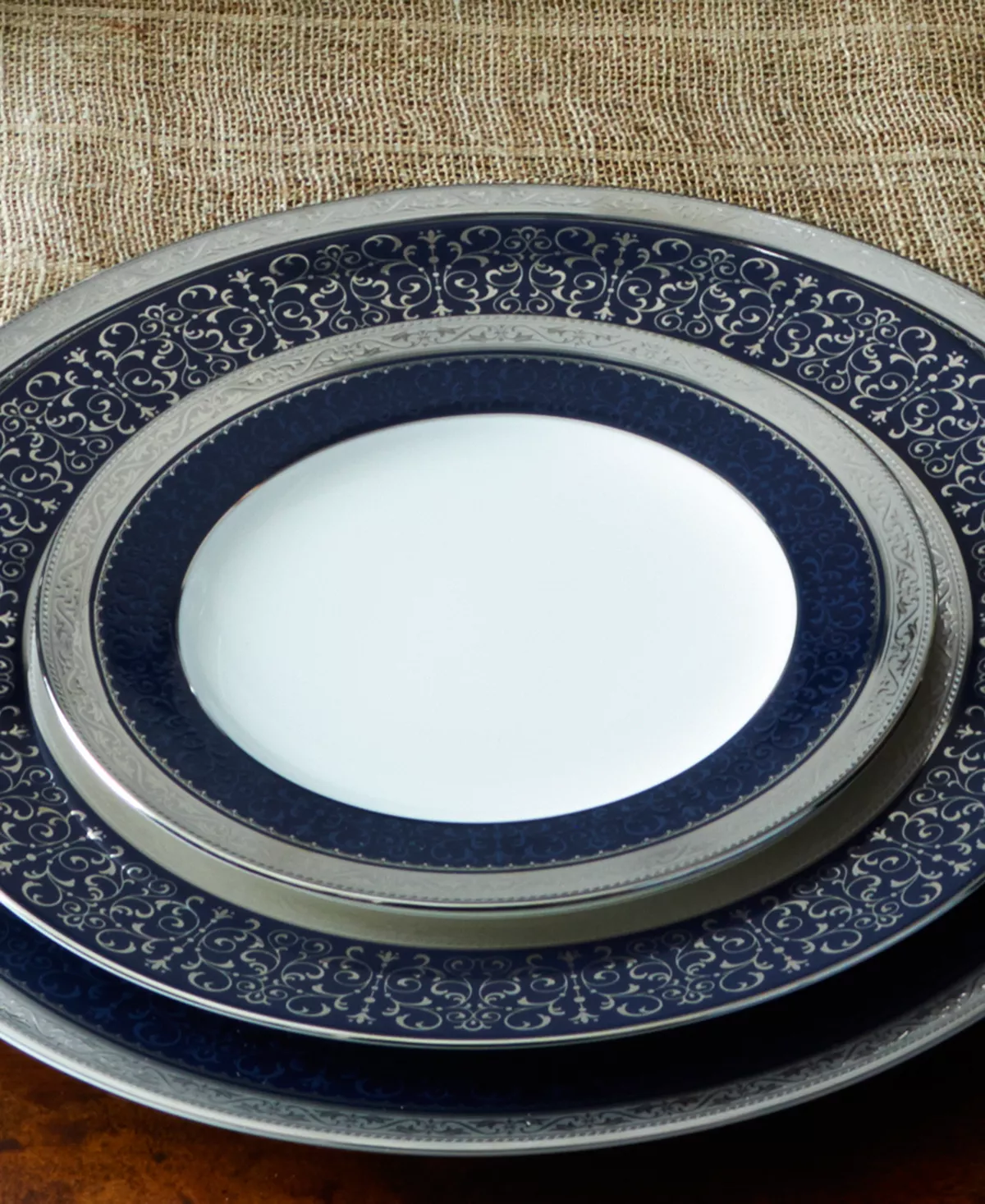Odessa cobalt platinum features a wide, etched platinum band, coupled with a wide inner band of delicate soft blue floral scrolls over a deep, cobalt blue. Crafted in fine bone China, Odessa cobalt platinum offers place setting components as well as an array of serving pieces and accessories.