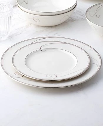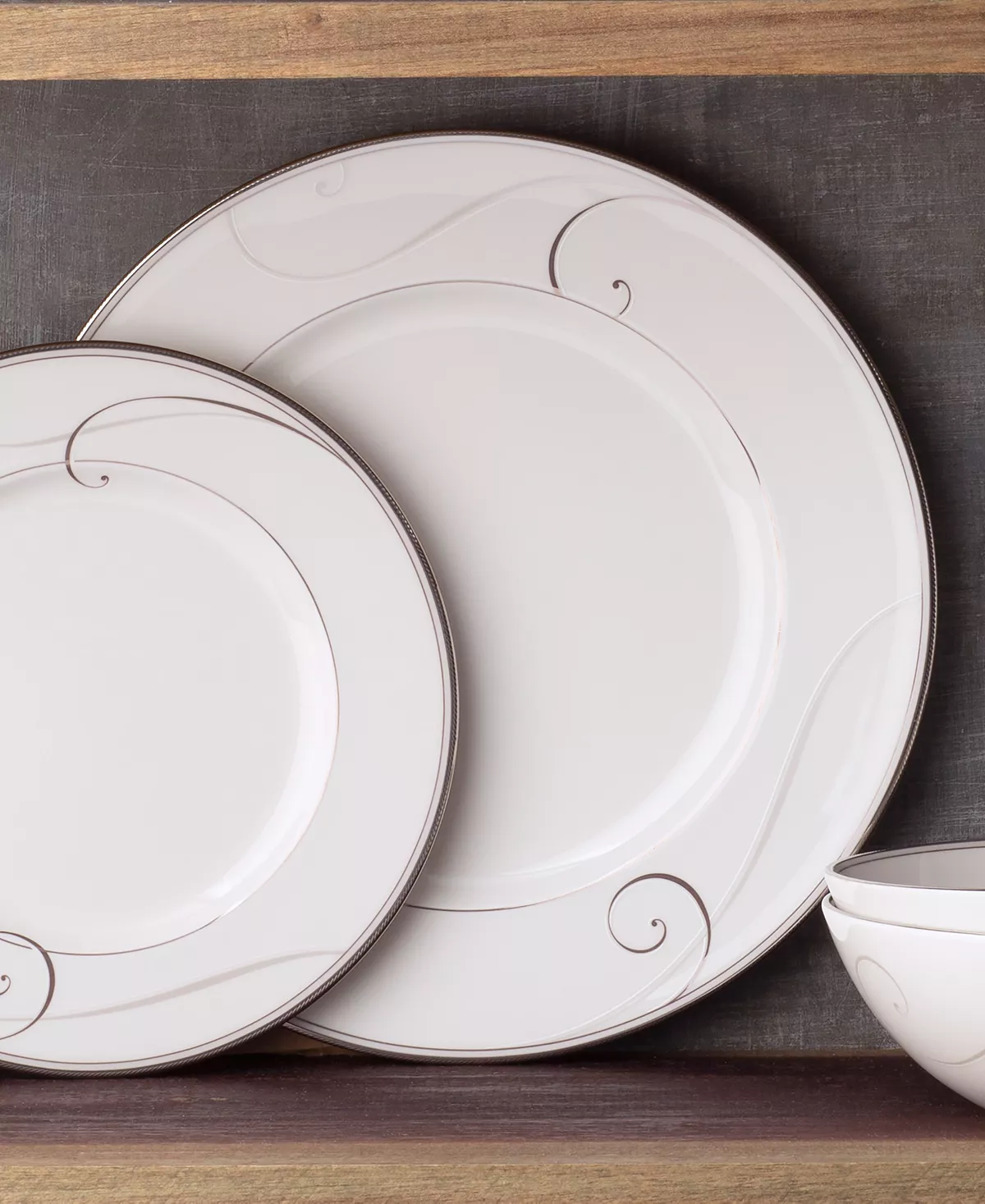 Platinum wave is a more relaxed approach to formal dinnerware. Keeping to a simple modern feeling, this pattern interprets a classic scroll motif in an updated and playful manner. Washing against the rim of the plate, the platinum waves create a bold, yet elegant presentation.