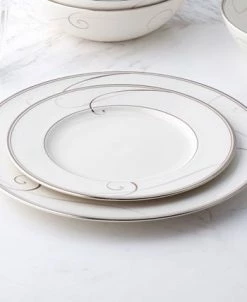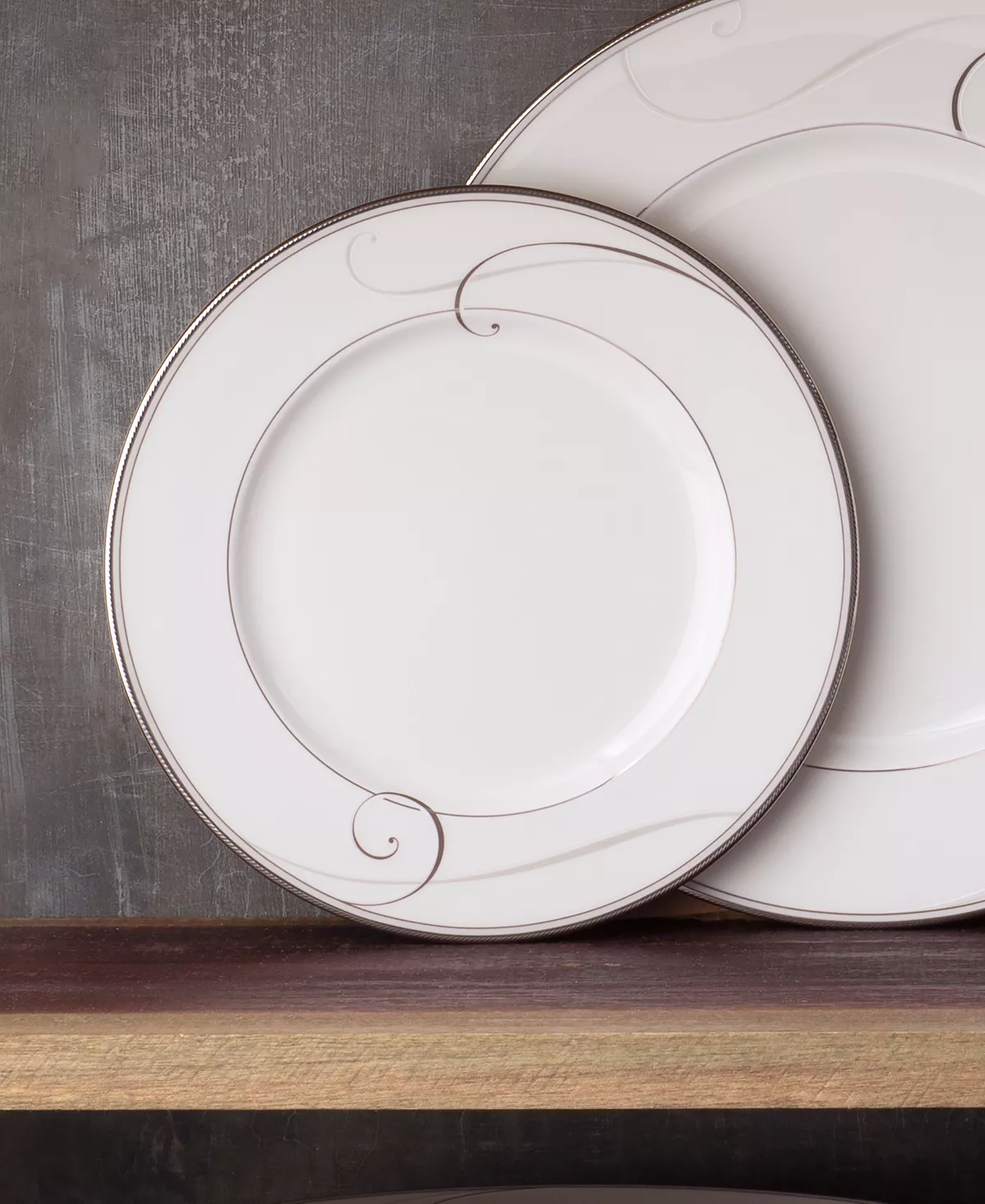 Platinum wave is a more relaxed approach to formal dinnerware. Keeping to a simple modern feeling, this pattern interprets a classic scroll motif in an updated and playful manner. Washing against the rim of the plate, the platinum waves create a bold, yet elegant presentation.