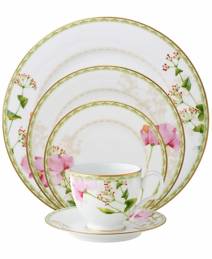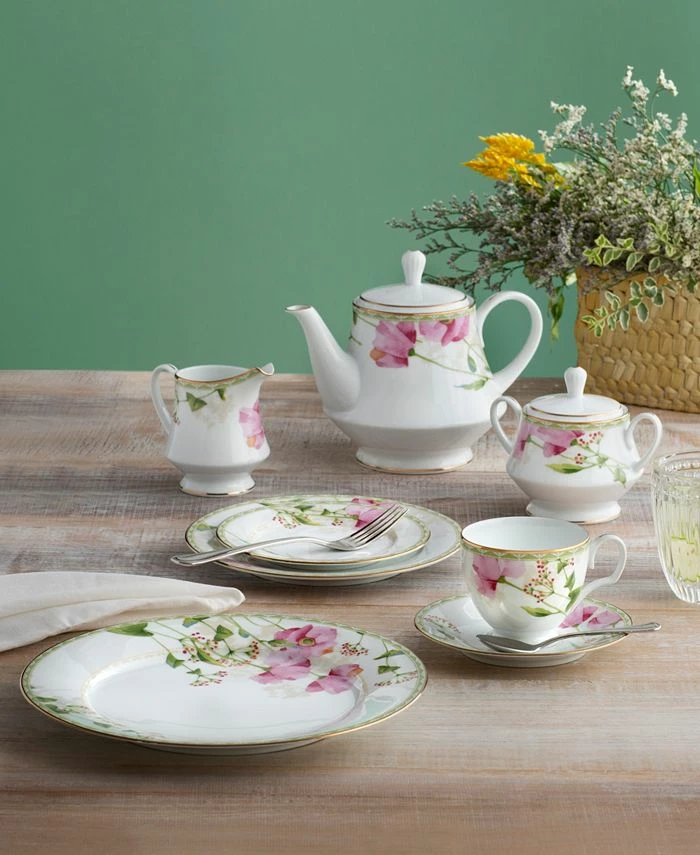 Poppy Place brings a light and airy garden to the table. Pink poppies are paired with elegant greenery, and the outer edges feature layered chevrons and a delicate gold edge. Poppy Place is crafted in white porcelain, is both microwave and dishwasher safe and is perfect for both everyday use and a more formal dining experience.