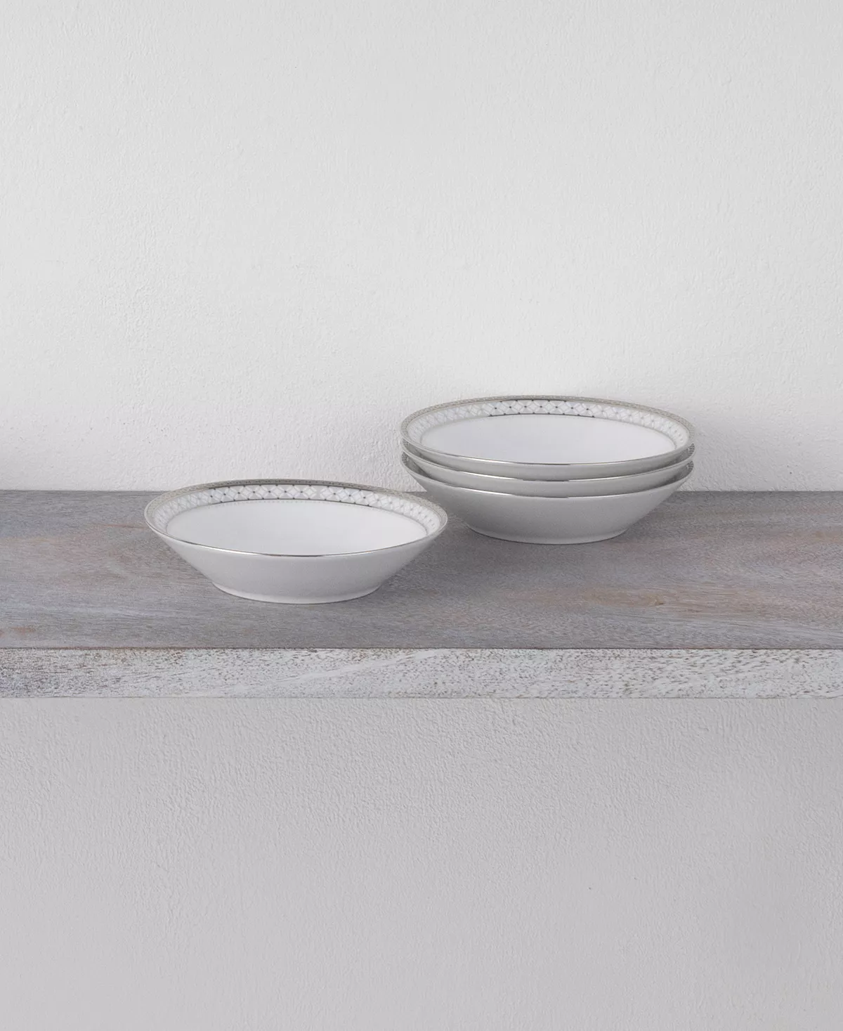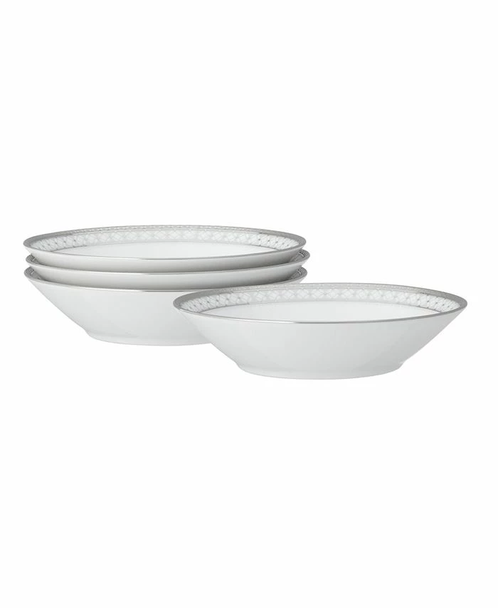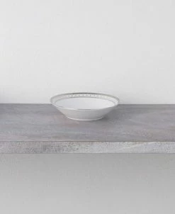 Rochester platinum features a circular grid, paired with platinum-on-platinum embossing, white embossing, and mica accents, all on classic white porcelain.