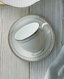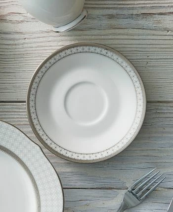 Rochester platinum features a circular grid, paired with platinum-on-platinum embossing, white embossing, and mica accents, all on classic white porcelain.