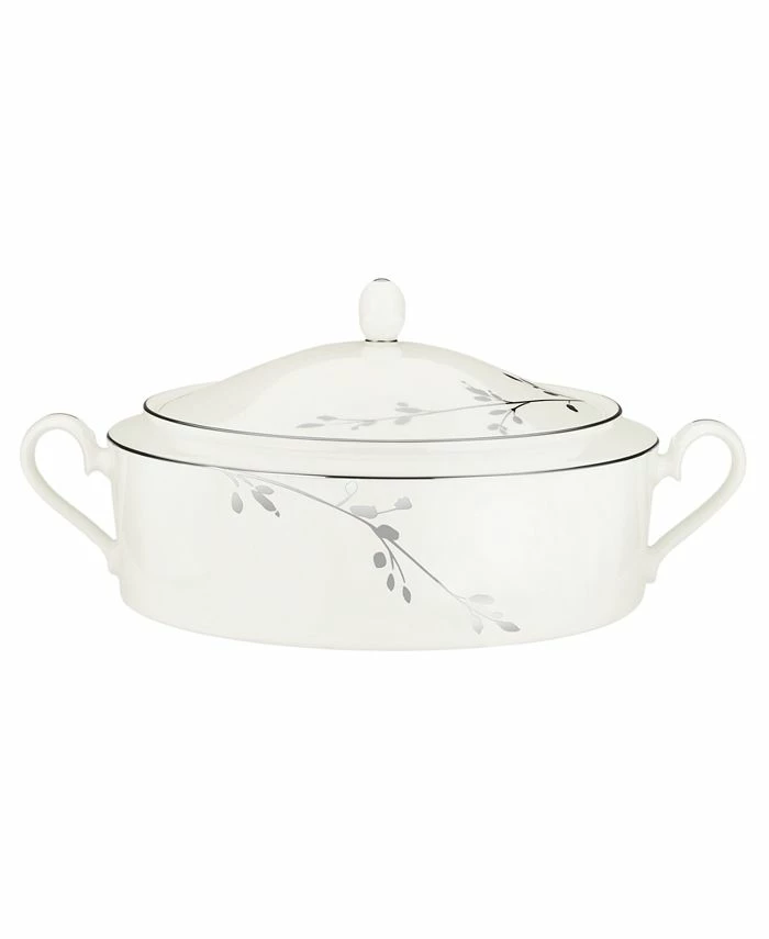 Birch branches grow around this pure white porcelain covered vegetable bowl, turning formal tables into serene landscapes. A contemporary design refined in polished platinum with a breezy, all-natural beauty. With double handles and an ornamented lid. From Noritake’s collection of serveware and serving dishes.