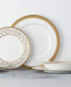 Summit gold is a mix of textures and visuals, pairing traditional and modern elements on bone China. Incorporated for more depth are touches of a finely speckled gray and monochromatic looping floral elements.