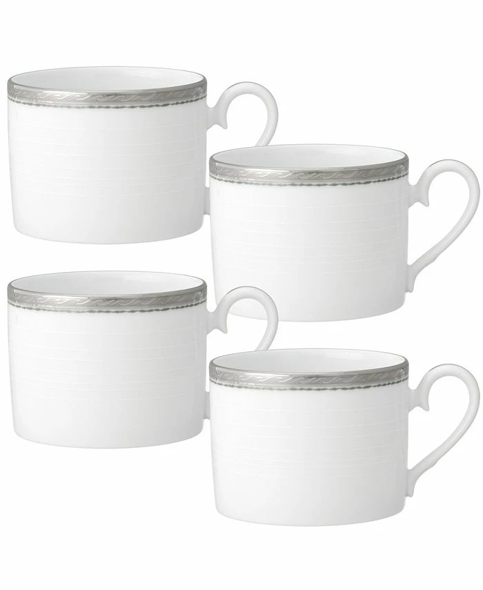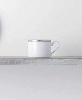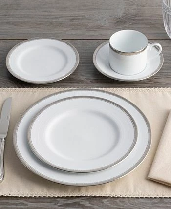 Whiteridge Platinum features multiple design elements. Items crafted in white porcelain feature ultrafine white-on-white raised ridges, which on selected items are alternated with a light grey. The wide outer platinum band is etched with waves flowing around the edge of each piece.