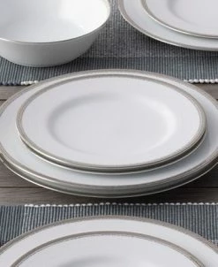 Whiteridge Platinum features multiple design elements. Items crafted in white porcelain feature ultrafine white-on-white raised ridges, which on selected items are alternated with a light grey. The wide outer platinum band is etched with waves flowing around the edge of each piece.