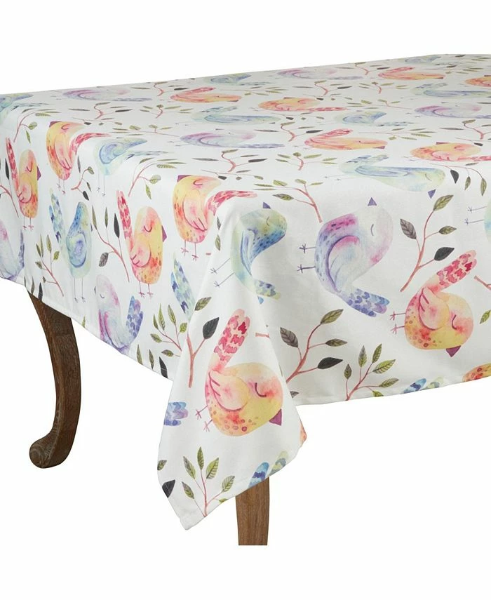 Protect your table against spills and scratches, while also giving it a beautiful backdrop with this charming flock of birds tablecloth. It features a rich pattern with multicolored birds and delicate tree branches. Pair with solid color dinnerware.