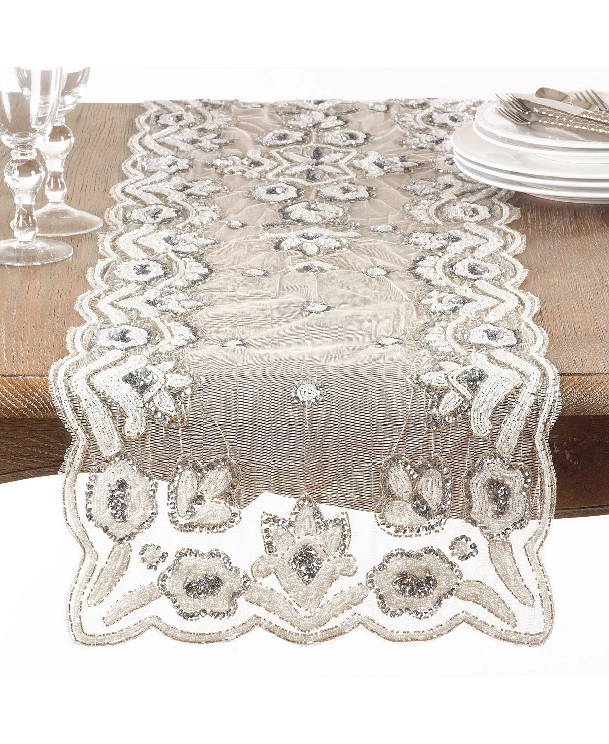 This hand-beaded table runner adds a touch of elegant flair to your dining room tablescape. Featuring a beautiful beaded floral pattern, the runner is sure to delight with its charming flourishes and looks stunning paired with metallic accents.
